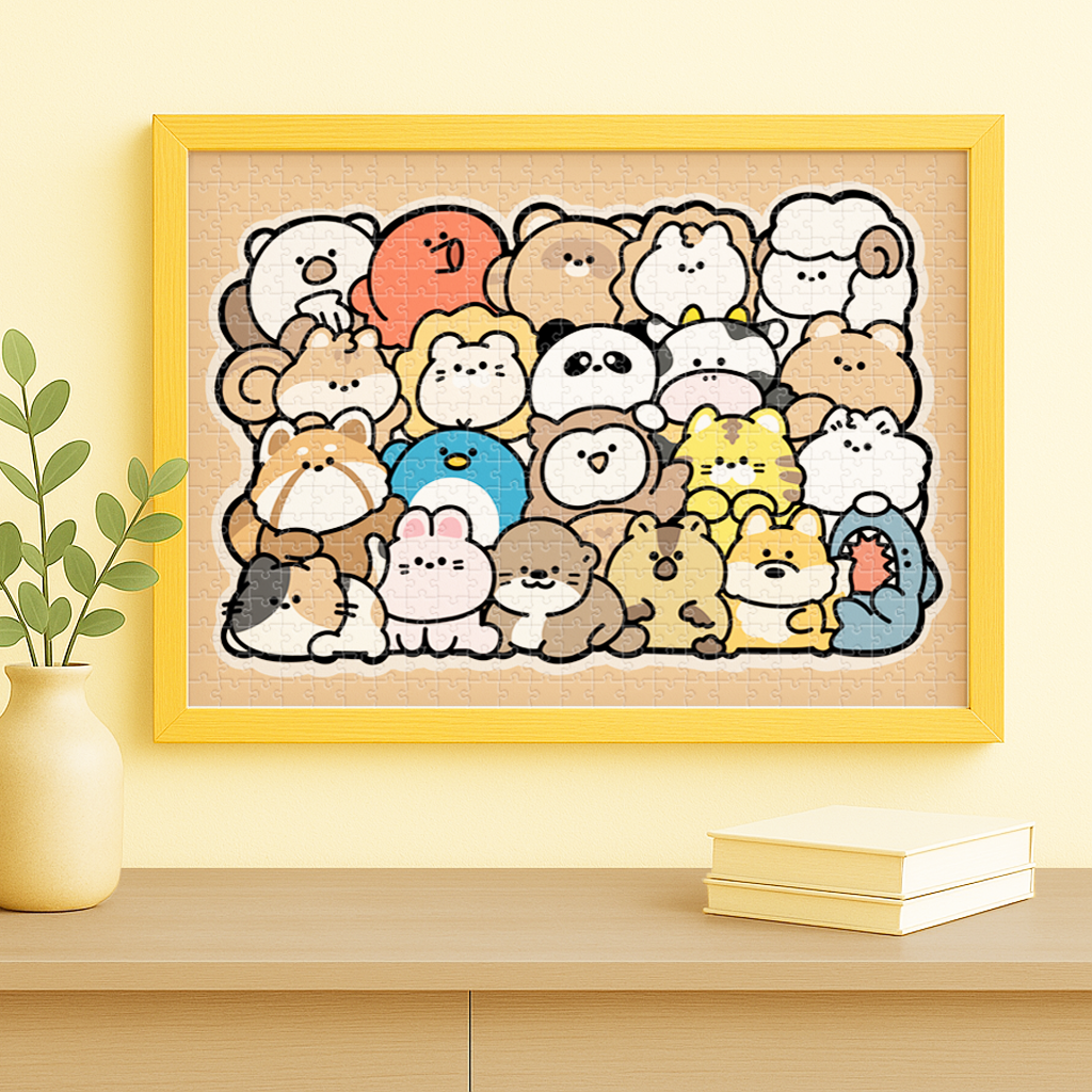 しみずさんが描く、やさしい表情の動物たちがぎゅっと集まったパズルが誕生しました。